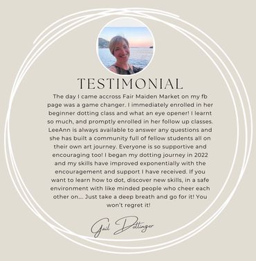 Come take a class with me! My pre-recorded tutorials have 8-10 hours of first class instruction. I offer lifetime access with a learn at your own pace approach. These classes are guaranteed to take your art to the next level whether you're a beginner, intermediate or advanced dot artist.